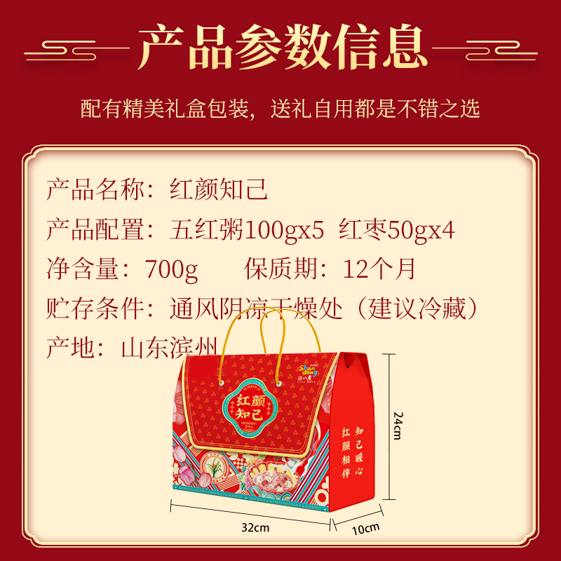 配置:五紅粥100g*5, 紅棗50g*4 凈重:0.7kg 粥配料:紅米\香米\血糯米\赤小豆\紅花生\紅枸杞 盒尺寸:32*10*24 箱重量:11.7kg 箱尺寸: 63*34*50 箱體積:0.107方