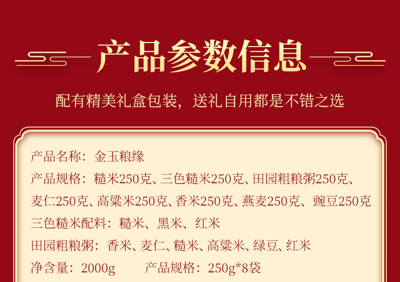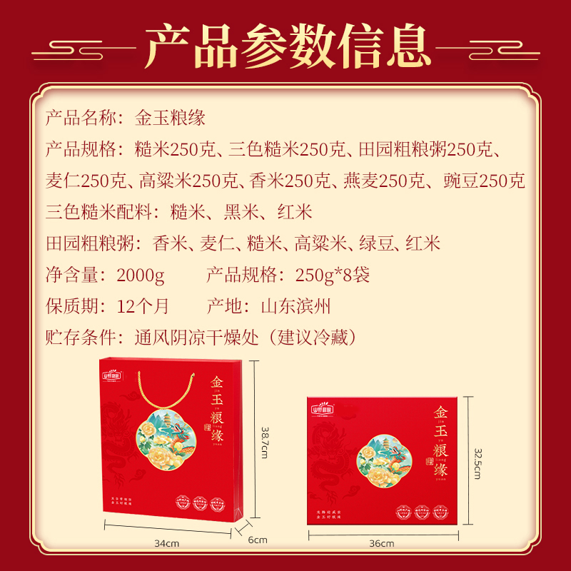 條 碼:6972761600734 規 格:2kg,250g*8 包 裝:真空方磚套彩盒 內 含:糙米、田園粗糧粥、豌豆、麥仁 燕麥、三色糙米、珍珠米、高粱米 禮 盒:36cm*32.5cm*4.5cm 手 袋:34cm*37.5cm*6cm 箱重量:26kg 箱尺寸:50*39*39(0.076方)