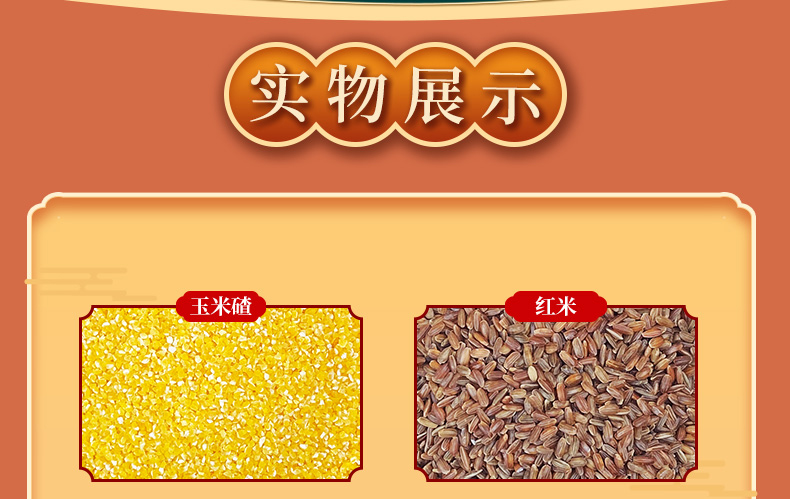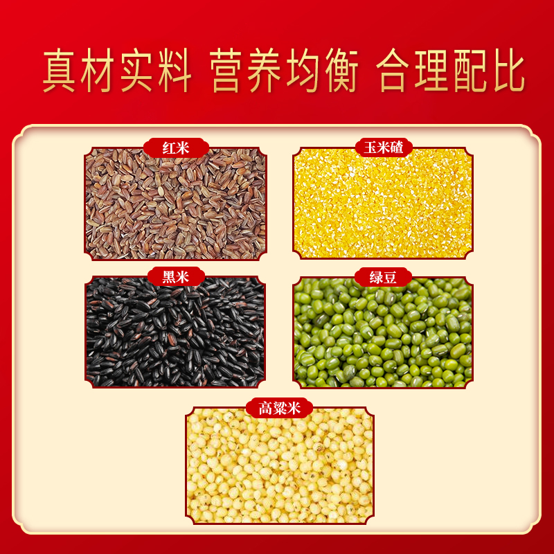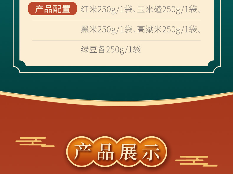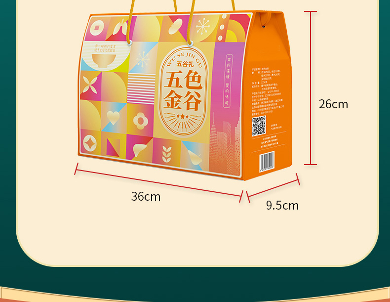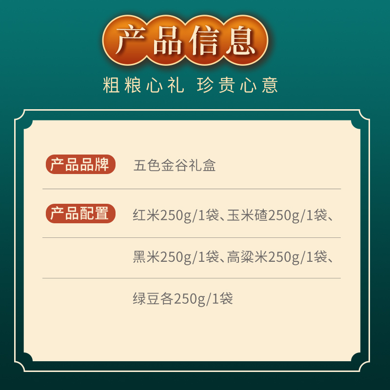 產品規格配置:紅米、綠豆、黑米、玉米碴、高粱米(250g*5袋) 盒尺寸:36*9.5*26cm 箱尺寸:60*37.5*54 箱重量:19.2kg 箱體積:0.122方