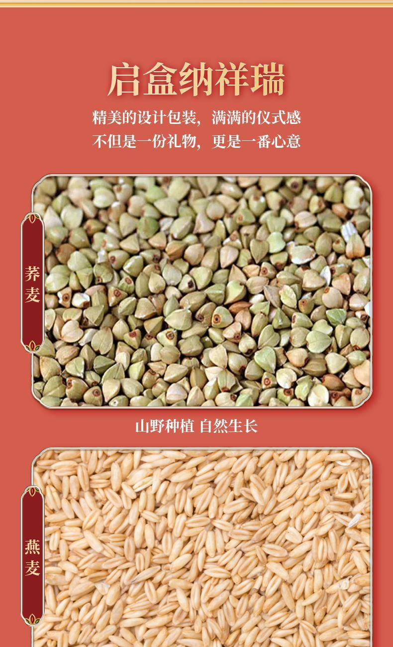 條 碼:6972761600567 規 格:2.5kg,250g/袋*10 配 置:蕎麥\燕麥\高粱米\麥仁\糯米 小米\黃豆\玉米碴\黑米\糙米 包 裝:抽真空外套彩袋 盒尺寸: 42cm*9.5cm*28.5cm 6盒 箱重量:18.34kg 箱尺寸:59.5*43*30(0.077方)